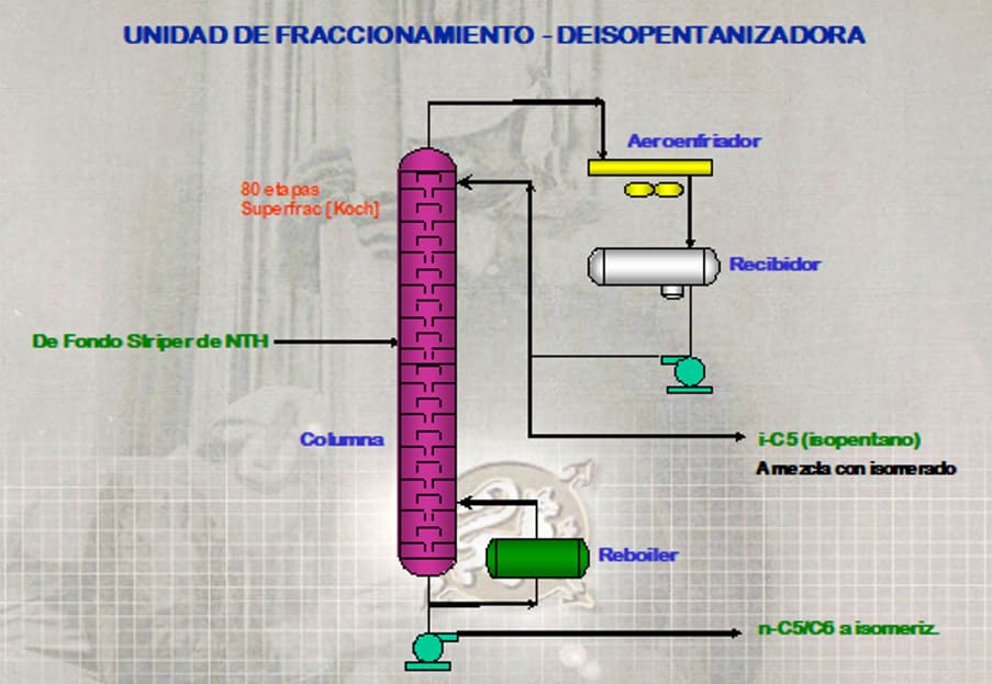 El objeto principal de esta unidad de procesamiento es el de separar la fracción de alto octano (isopentano), de un corte susceptible de ser isomerado (C5/C6 de cadena lineal).
